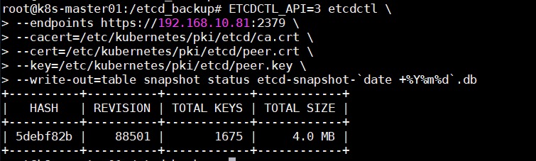 --write-out=table snapshot status /etcd_backup/etcd-snapshot-`date +%Y%m%d`.db