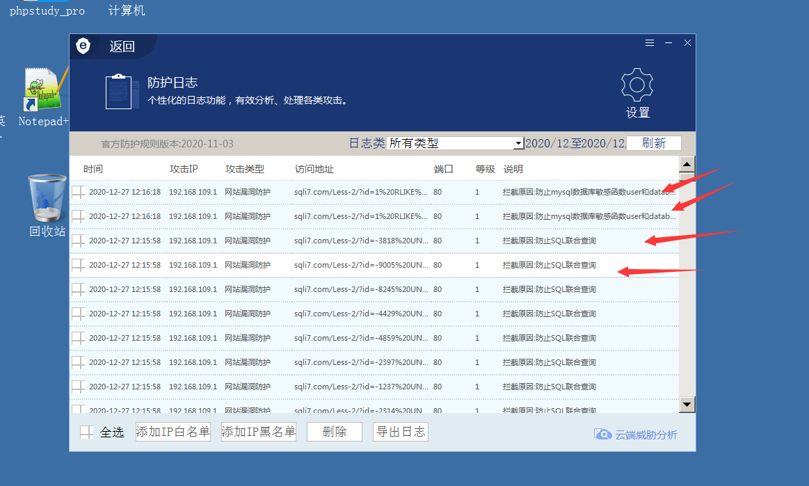 可以发现,现在已经成功扫描到注入点,但是只扫描到一种(应该有4种注入方式),说明还是被安全狗拦截了;通过waf日志可以看到现在安全狗是对注入语句进行了拦截;如果需要绕过,我们就需要自己编写脚本进行绕过了~