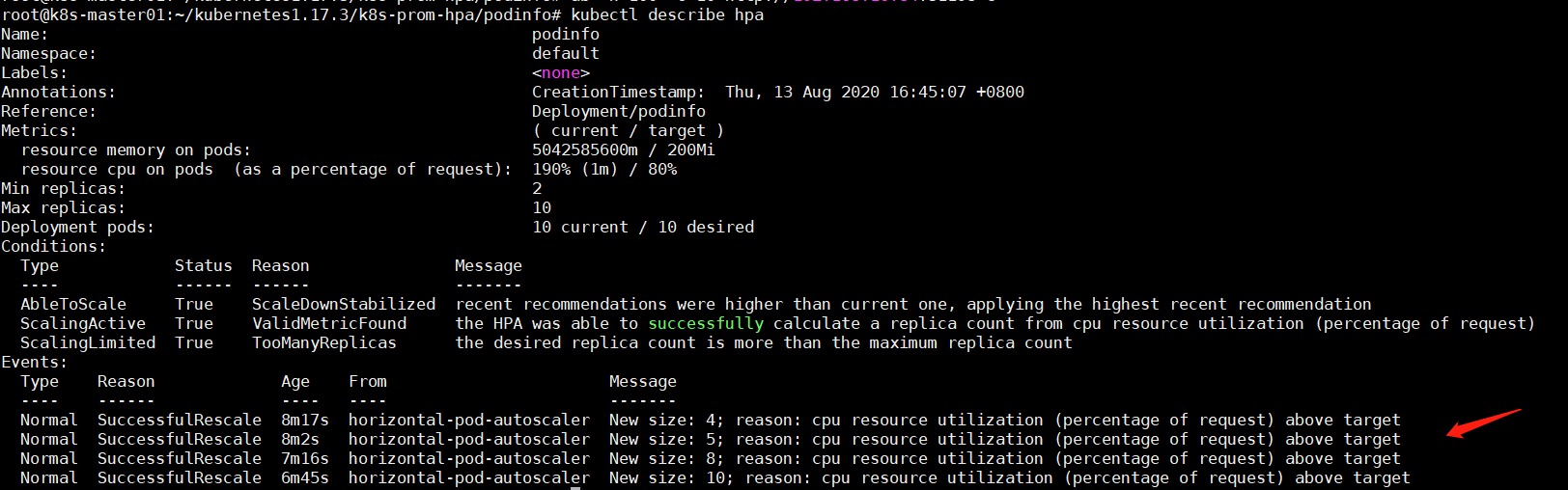 创建一个HPA,如果请求数量超过每秒10个,将扩容podinfo应用