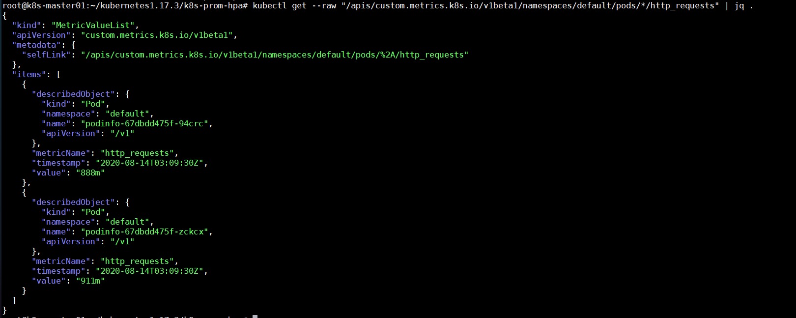 kubectl get --raw "/apis/custom.metrics.k8s.io/v1beta1/namespaces/default/pods/*/http_requests" | jq .