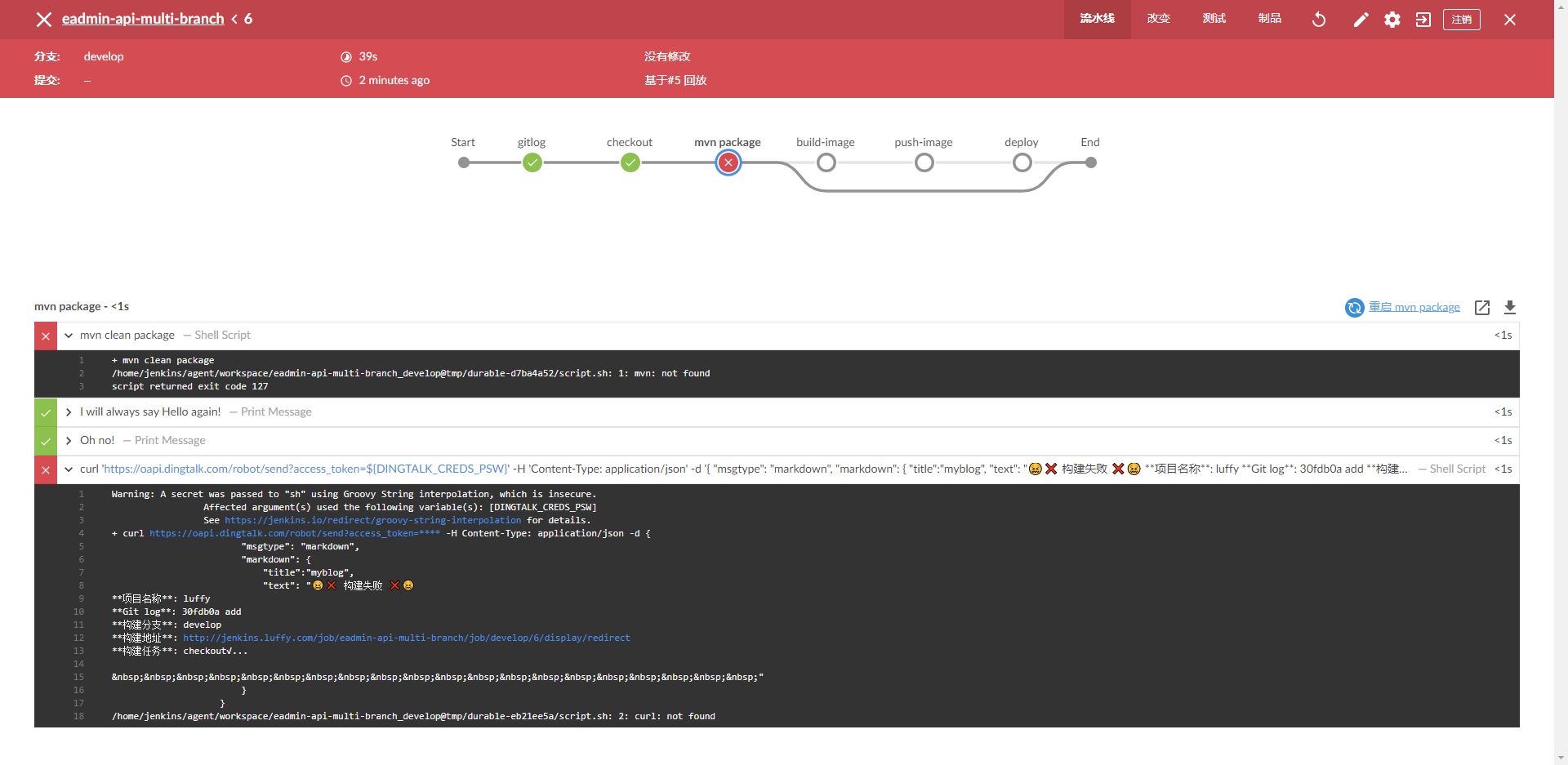 "text": "😖❌ 构建失败 ❌😖 \n**项目名称**: luffy \n**Git log**: ${GIT_LOG} \n**构建分支**: ${GIT_BRANCH} \n**构建地址**: ${RUN_DISPLAY_URL} \n**构建任务**: ${BUILD_TASKS}"