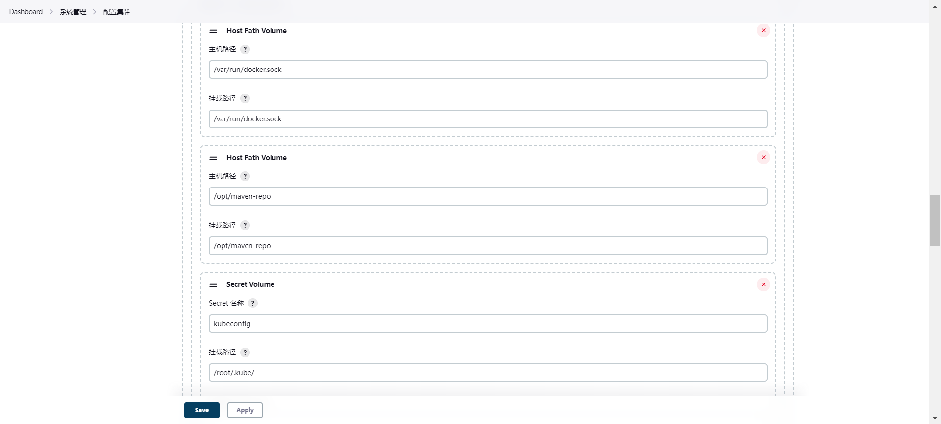 工作空间卷:选择hostpath,设置/opt/jenkins,注意需要设置目录权限,否则Pod没有权限