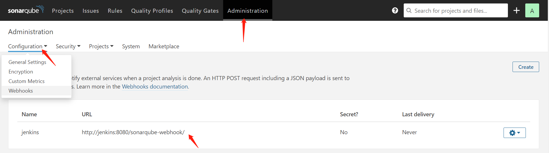 则需要在sonarqube服务端进行如下配置,添加一个webhook: