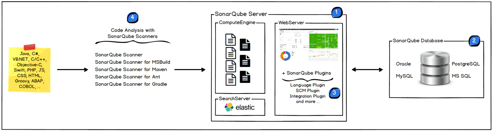 - SonarQube服务器处理和存储分析报告导致SonarQube数据库,并显示结果在UI中