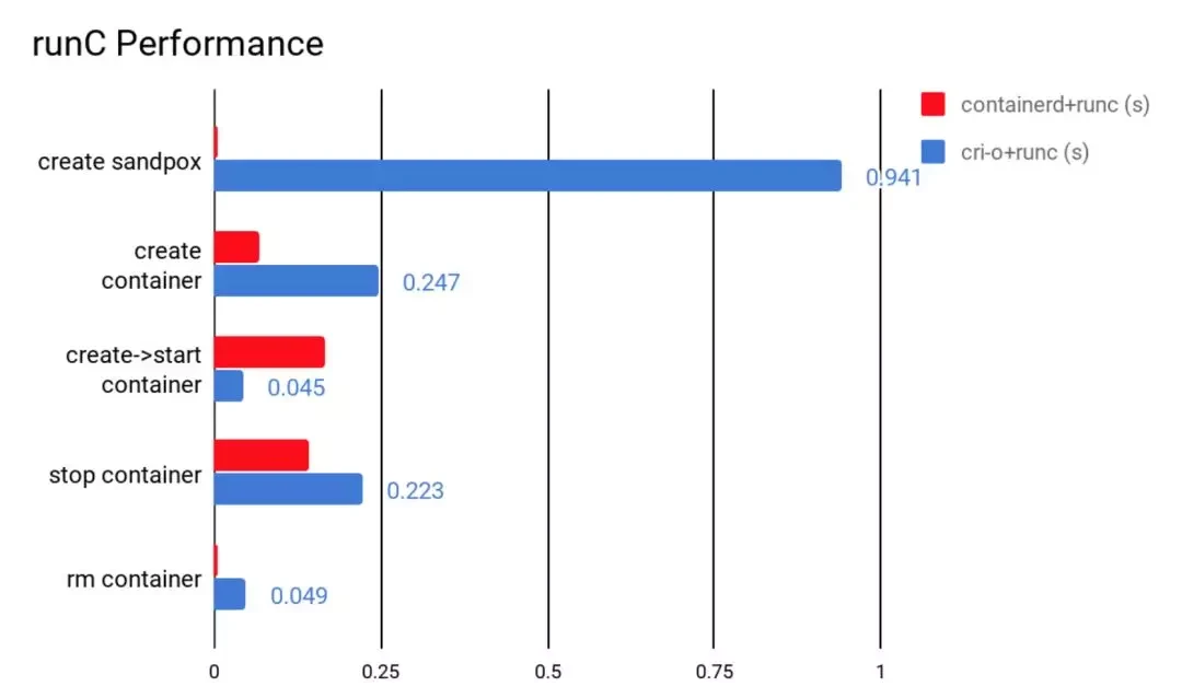 我们对 containerd 和 cri-o 进行了一组性能测试,包括创建、启动、停止和删除容器,以比较它们所耗的时间。如图 4 所示,containerd 在各个方面都表现良好,除了启动容器这项。从总用时来看,containerd 的用时还是要比 cri-o 要短的。