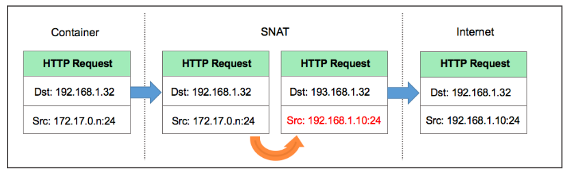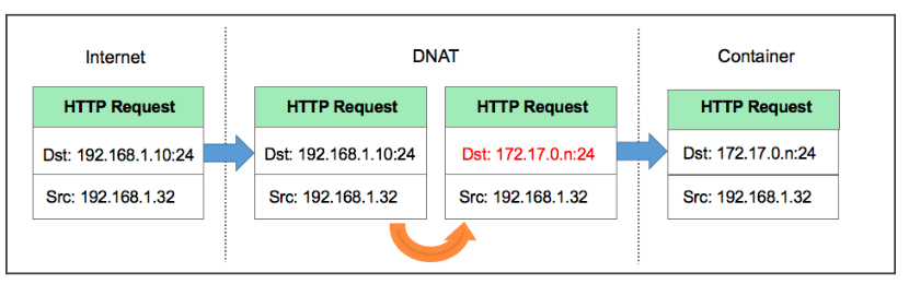 进到容器内的包做DNAT,出去的包做SNAT,这样对外面来讲,根本就不知道机器内部是谁提供服务,其实这就和一个内网多个机器公用一个外网IP地址上网的效果是一样的,那这也属于NAT功能的一个常见的应用场景。