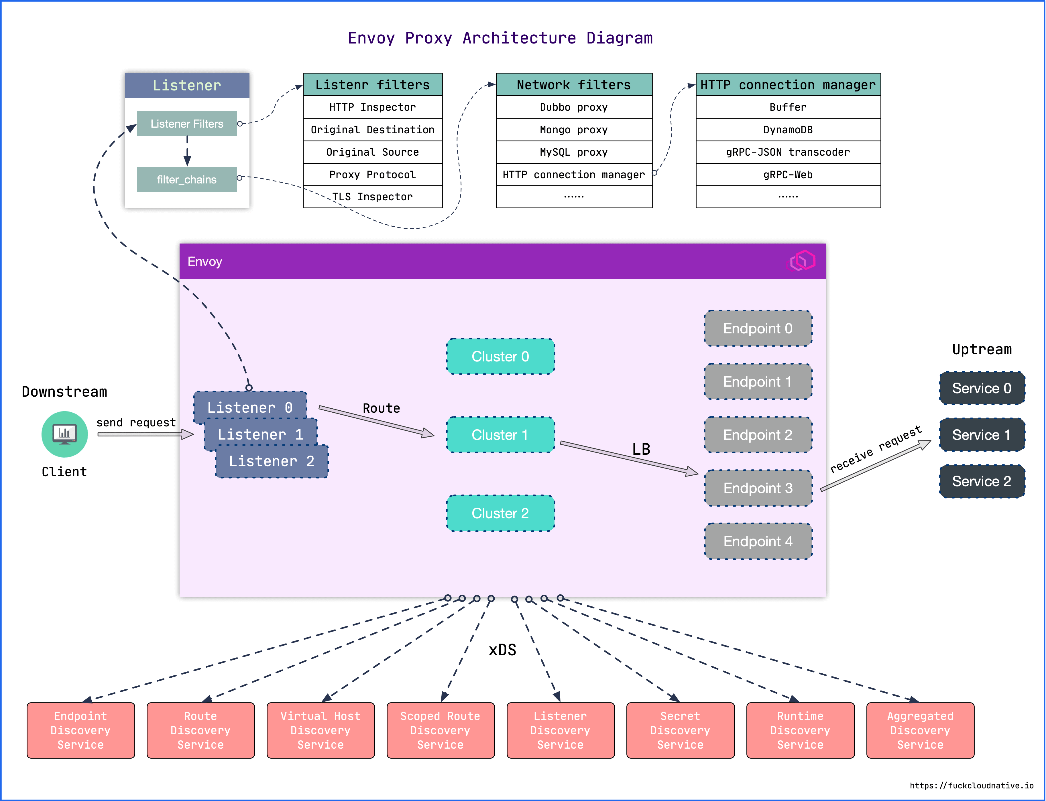 Envoy 接收到请求后,会先走 FilterChain,通过各种 L3/L4/L7 Filter 对请求进行微处理,然后再路由到指定的集群,并通过负载均衡获取一个目标地址,最后再转发出去。
