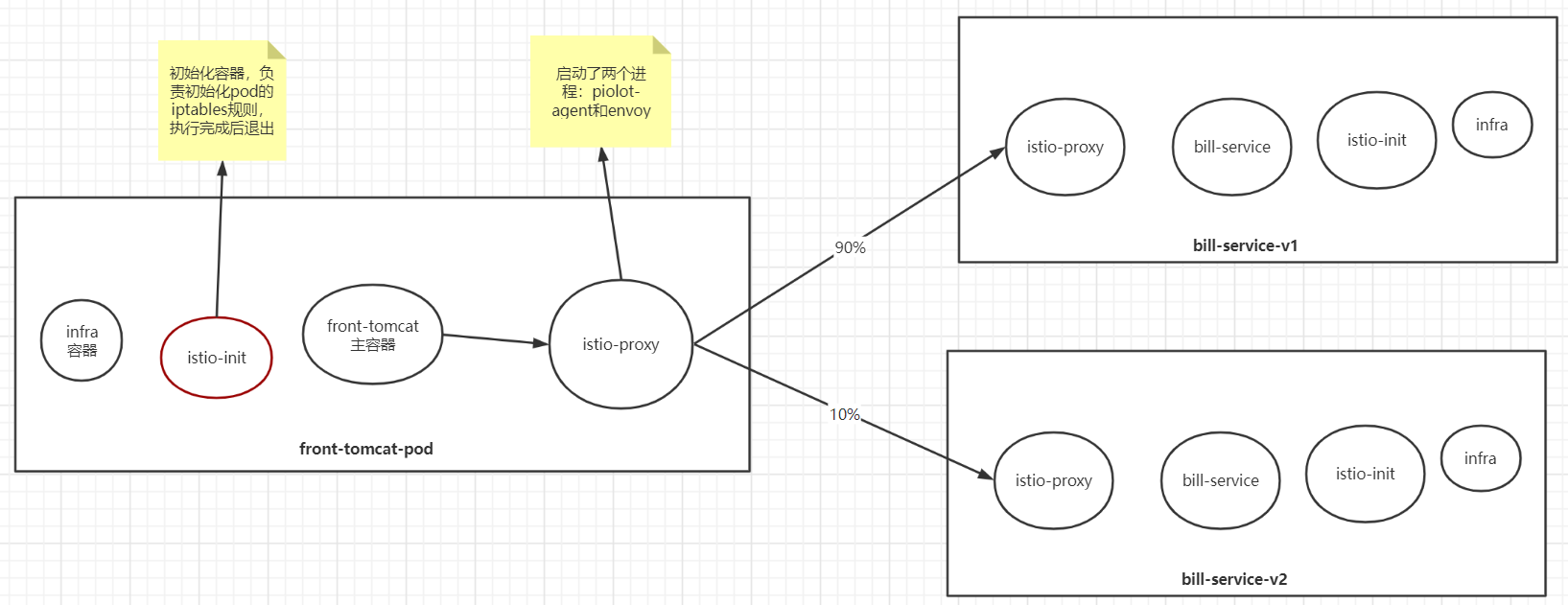 - 在istio的网格内,front-tomcat访问到bill-service,流量的流向是怎么样的?