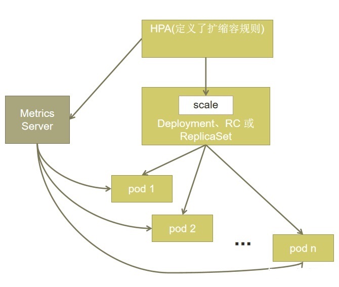 基本原理:HPA 通过监控分析控制器控制的所有 Pod 的负载变化情况来确定是否需要调整 Pod 的副本数量