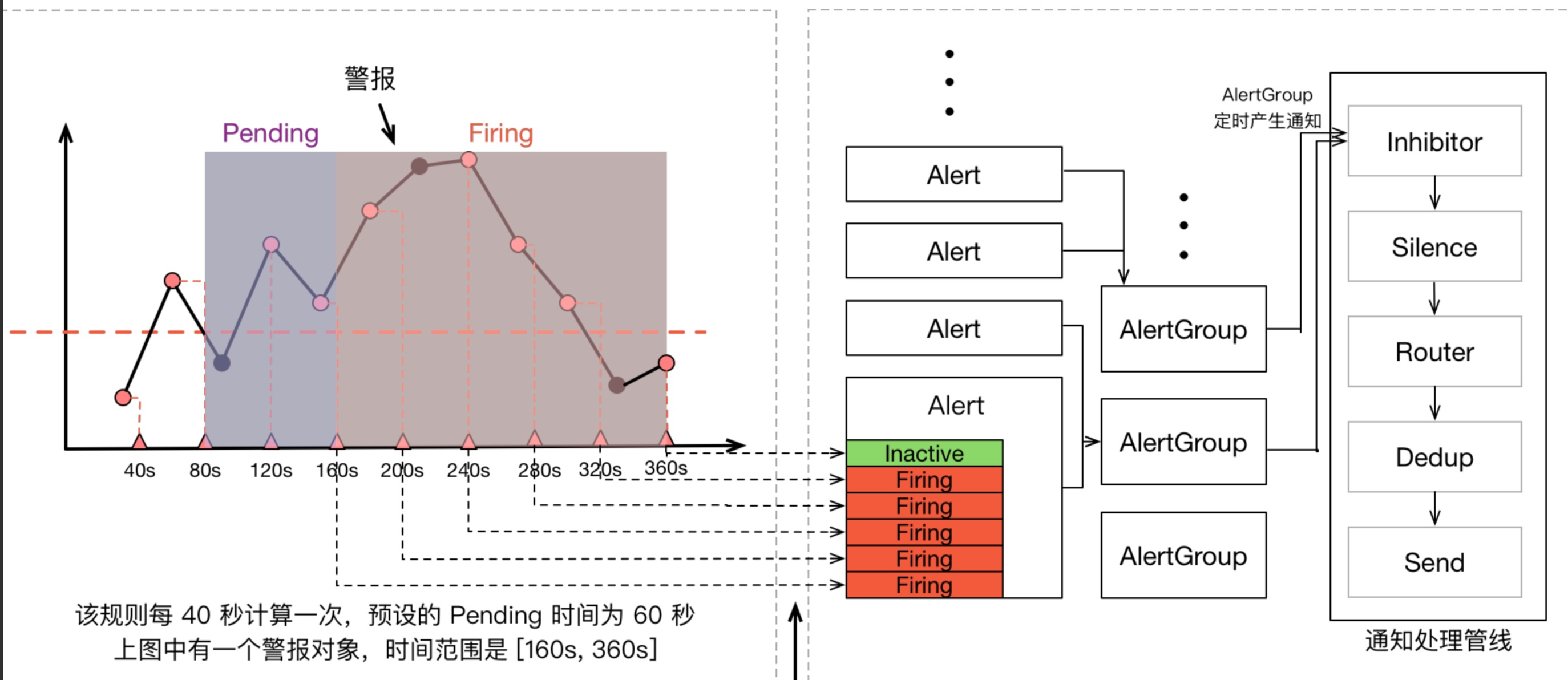一条告警产生后,还要经过 Alertmanager 的分组、抑制处理、静默处理、去重处理和降噪处理最后再发送给接收者。这个过程中可能会因为各种原因会导致告警产生了却最终没有进行通知,可以通过下图了解整个告警的生命周期: