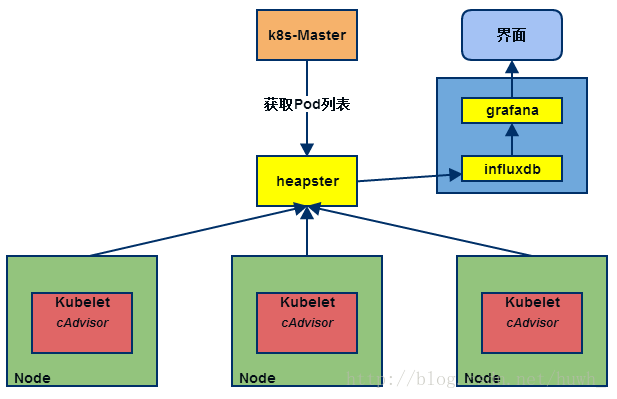 heapster负责调用各node中的cadvisor接口,对数据进行汇总,然后导到InfluxDB , 可以从cluster,node,pod的各个层面提供详细的资源使用情况。